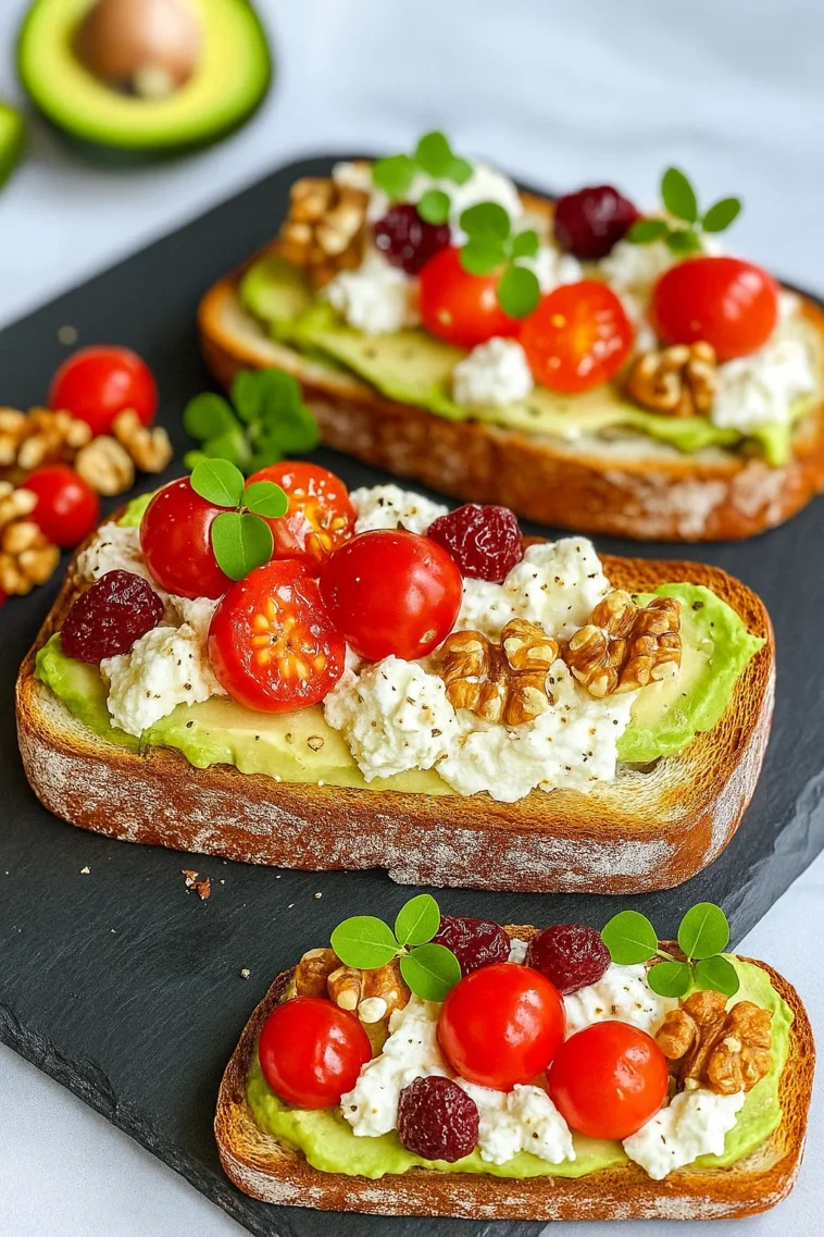 Il toast di avocado con feta, pomodorini, mirtilli rossi e noci è una ricetta semplice ma sofisticata, ideale per ravvivare i tuoi pasti veloci. Veloce, nutriente e delizioso, unisce il meglio dei sapori dolci, salati e croccanti.
