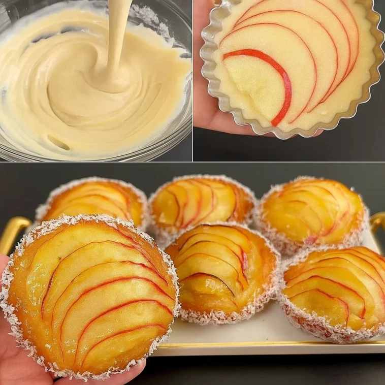 Versate una piccola quantità di impasto in ogni stampo, quindi disponete le fettine di mela sottili a ventaglio sulla superficie, sovrapponendole leggermente per un aspetto elegante.